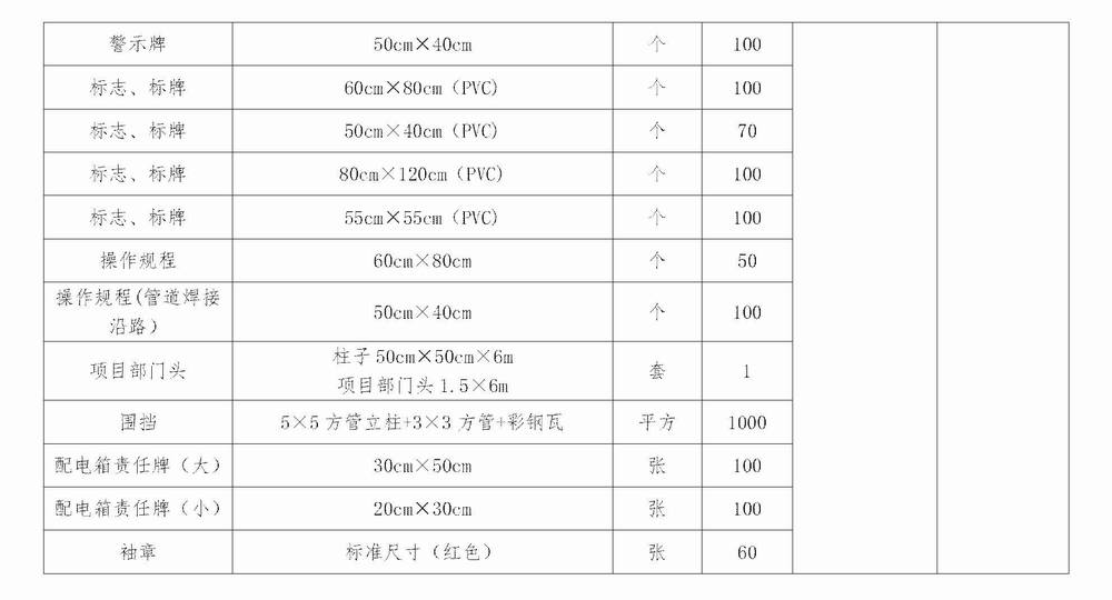 1.2.1采購范圍:預計本項目采購標識標牌、海報、旗幟等安全標準化制安物資一批,采購人可根據工程實際情況對貨物采購數量進行調整,供貨數量以實際需求數量為準,成交人不得因此提出單價調整或提出任何賠償;