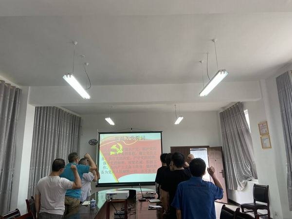 隨后,在趙曉輝的帶領下,全體黨員面對鮮紅的黨旗,鄭重舉起右手,莊嚴向黨宣誓。誓詞聲聲,表達了忠于黨的事業、永葆黨員先進性的堅定信念。最后組織觀看了警示教育片《初心裂變之殤》,結合警示教育研究了黨風廉政建設和風險防控工作。