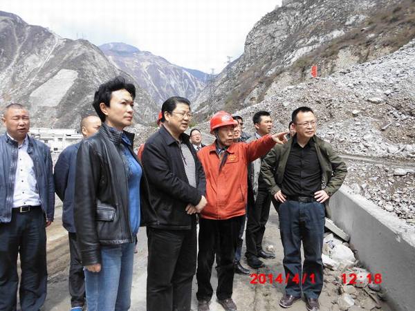 2014年4月1日上午,晴空萬里,陽光燦爛。汶川縣縣委書記蔣剛、縣長旺娜,副縣長鄧時光、副縣長江學成、水務局局長傅劍及相關各局、鎮(鄉)領導到我局三機處承建的汶川河道治理下索橋標段工地檢查指導工作。