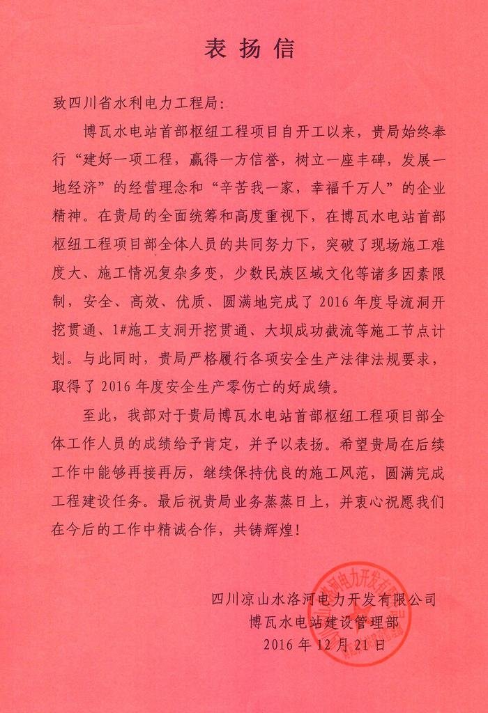 博瓦水電站建設管理部致工程局表揚信