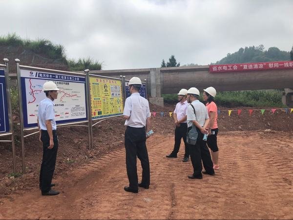 2018年8月9日,四川省水電工會主席馬勇仕帶領辦公室主任蘇吉斌、財務部張紅、徐蕾一行,前往工程局承建的都江堰灌區(qū)毗河供水一期工程第五施工分部公孫溝渡槽工地,看望慰問高溫下工作的一線勞動者,為他們送去消暑降溫物品、慰問金和貼心的關懷。
