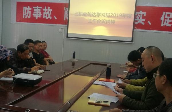 2019年4月11日,三機處在博瓦電站項目部組織全處職工學習貫徹工程局2019年工作會議精神,會議由支部副書記、工會主席閻旭主持。