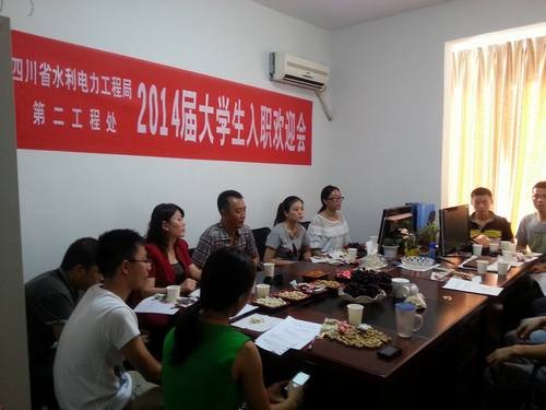 2014年7月21日下午17時,局第二工程處在處辦公室召開了2014屆大學生入職歡迎會。會議由處勞資科長楊道雄主持。二處工會主席、辦公室主任陳暉,固滴項目部副經理曹軍到會指導,處各科室人員及新入職的10名大學生參加了會議。