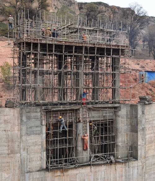 2、廠房取水口一期砼澆筑完成,現正進行閘門金結安裝。廠房1#機、2#機主機段一期砼澆筑到1915.9m高程(發電機層設計高程1915.9m高程,其上為鋼排架,一期砼澆筑完成),管型座二期砼澆筑完成;3#機主機段一期砼澆筑到1915.9m高程,管型座二期砼澆筑到1912.1m高程(水機層設計高程1913.1m高程)。副廠房一期砼澆筑到1915.9m設計高程,澆筑完成。廠房下游尾水閘室一期砼澆筑完成,現正進行閘門金結安裝。