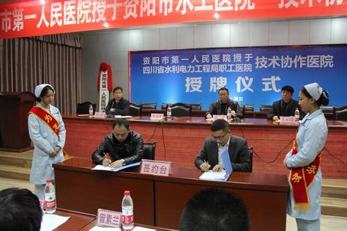 資陽市第一人民醫院副院長溫澤強與局職工醫院副院長何建山現場簽訂了協作醫院合作協議,溫澤強為合作醫院授牌。