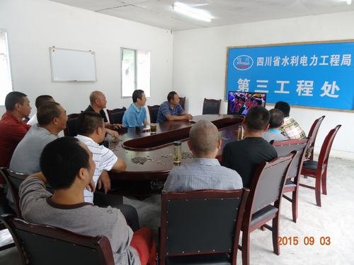 2015年9月3日上午,三處處長李軍帶領(lǐng)三處領(lǐng)導(dǎo)班子、處各科室主要負(fù)責(zé)人,在后溝水庫項目部會議室組織職工觀看紀(jì)念中國人民抗日戰(zhàn)爭暨世界反法西斯戰(zhàn)爭勝利70周年紀(jì)念大會電視直播。