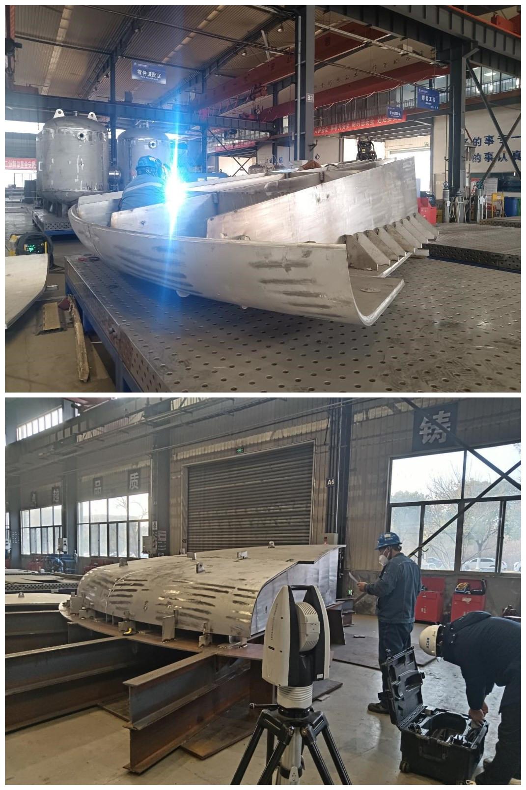 項目籌備精益求精。項目初期,項目團隊相繼成立“星火聚變”黨員突擊隊和“披荊斬棘”青年創新突擊隊,突擊隊根據客戶要求及11m超大直徑帶來的制造及運輸難點,經過多輪技術評審明確了分瓣封頭的材質要求、尺寸規格及特殊工藝需求。技術人員進行三維建模、焊縫模擬分析、尺寸鏈分析等多輪分析,確保每個零件的每個工序尺寸都符合設計要求。同時,生產人員制定了詳盡的生產計劃,并進行全流程動態跟蹤,從原材料采購到封頭壓制、預組對、1/8組焊,每一步都力求精準無誤。